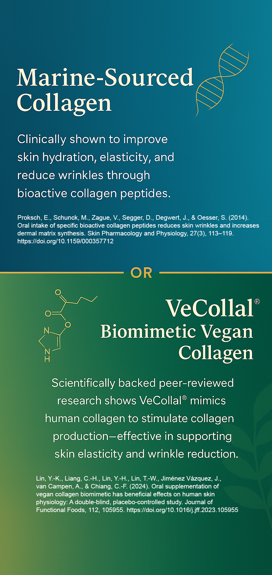 At Synergy Source Labs, science guides every step—from initial research through formulation to final testing. We meticulously analyze emerging evidence and select ingredients supported by peer-reviewed studies to provide optimal collagen support and holistic wellness. In addition to the many supportive ingredients in our synergy blends, we offer the choice of either marine-sourced (fish) collagen or VeCollal® biomimetic vegan collagen—two scientifically backed options designed to meet different wellness needs.